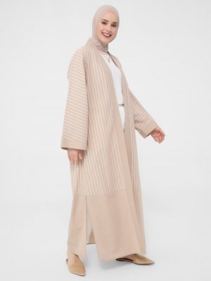 Refka Casual Bej Çizgili Garnili Oversize Pamuk Kap