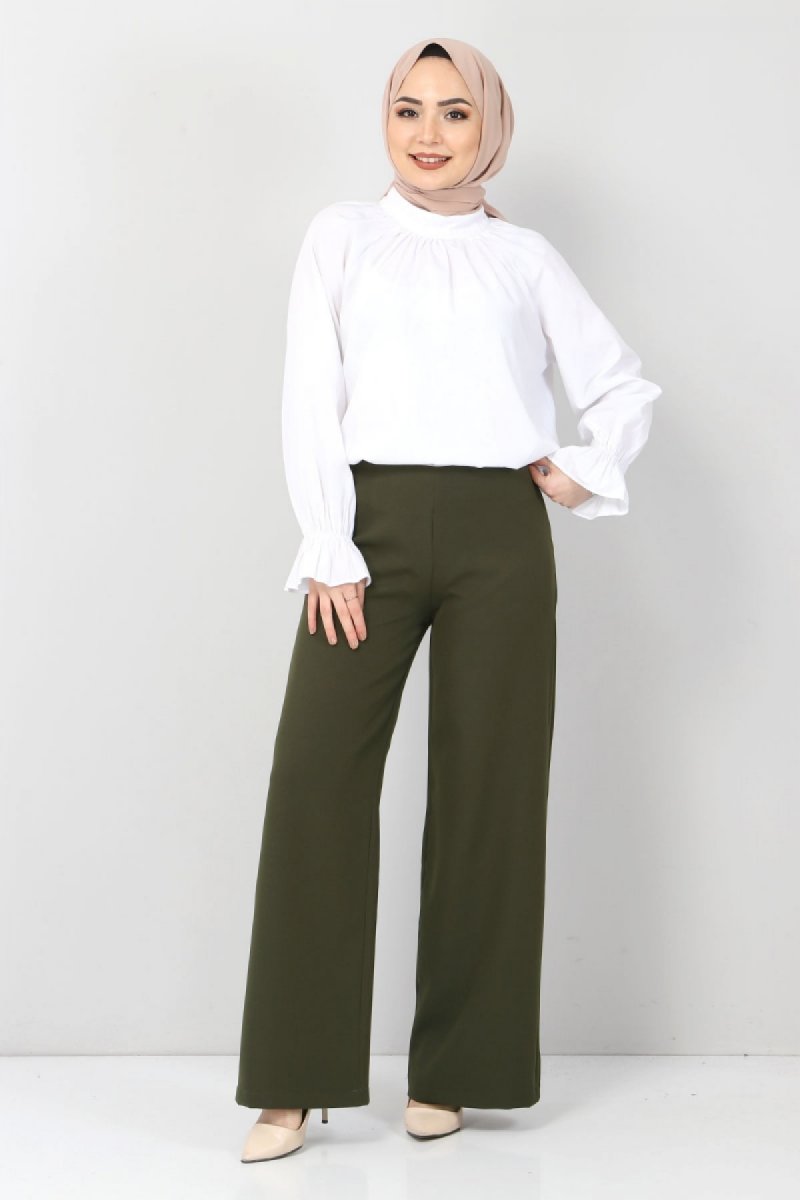 Tesettür Dünyası Haki Bol Paça Kumaş Pantolon