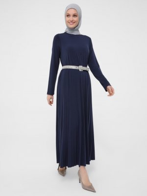 Refka Lacivert Piliseli Rahat Kesim Sandy Elbise