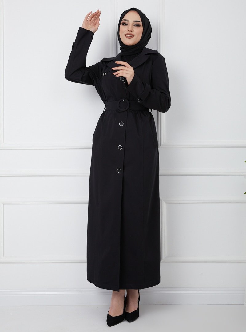 Olcay Siyah Kemer Detaylı Pamuklu Astarsız Uzun Trençkot