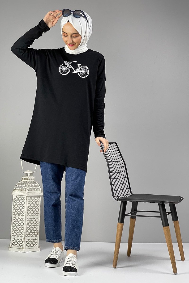 MODAPİNHAN Siyah Salaş Baskılı Tunik