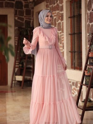 Amine Hüma Pembe Pudra Kemerli Fırfırlı Elbise