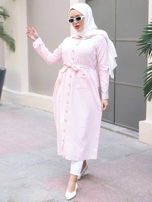 Por La Cara Pembe Boydan Düğmeli Çift Cepli Kemerli Elbise