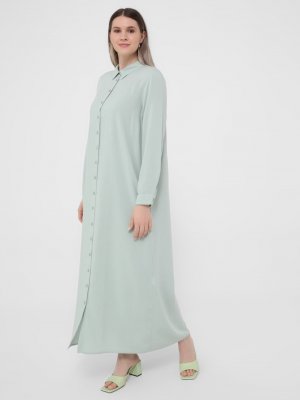 Alia Su Yeşili Büyük Beden Düğme Detaylı Doğal Kumaşlı Gömlek Elbise