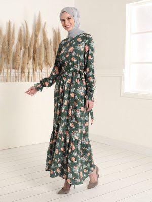 Tavin Haki Doğal Kumaşlı Çiçek Desenli Beli Lastikli Elbise