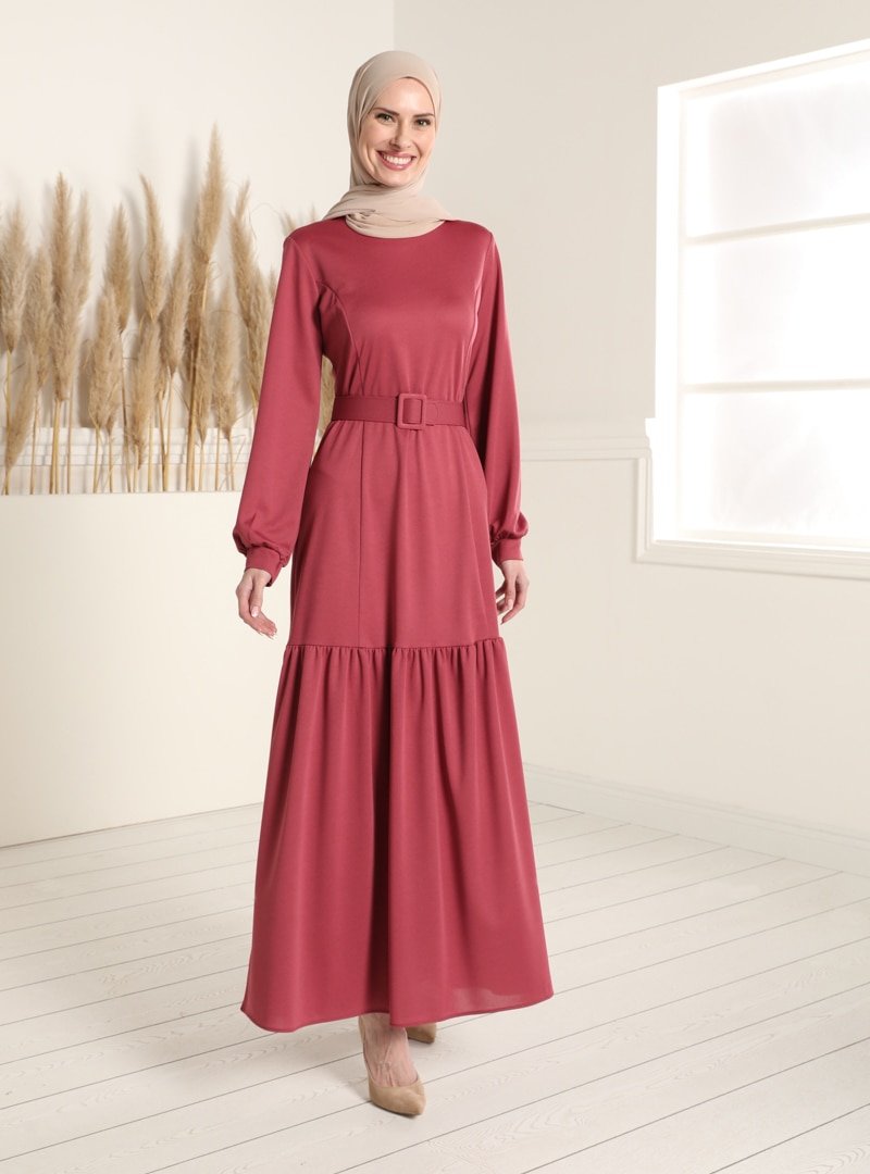 Tavin Koyu Gül Kurusu Kemerli Elbise