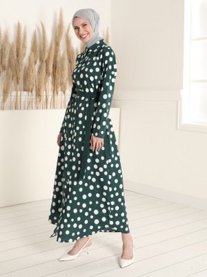 Tavin Zümrüt Yeşili Kuşaklı Puantiye Desenli Elbise