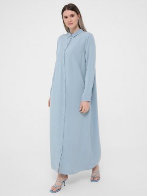 Alia Buzul Mavi Büyük Beden Düğme Detaylı Doğal Kumaşlı Gömlek Elbise