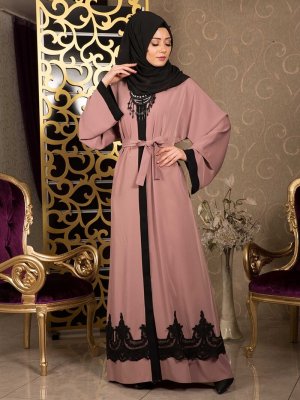 İz Otantik Gül Kurusu Dantel Detaylı Ferace