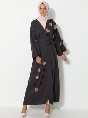 İz Otantik Gri Güpür Çiçek Detaylı Kimono