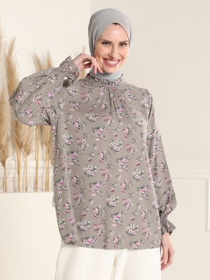 Tavin Gri Doğal Kumaşlı Çiçek Desenli Tunik