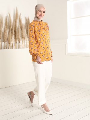 Tavin Safran Doğal Kumaşlı Çiçek Desenli Tunik