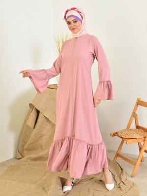 Filizzade Gül Kurusu Fermuarlı Fırfır Detaylı Ferace