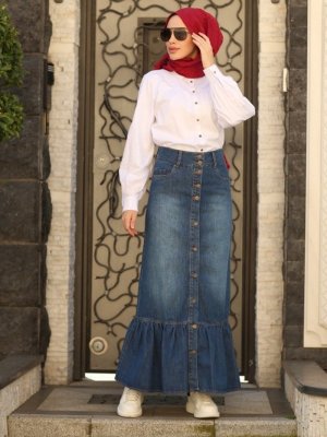 Neways Koyu Mavi Fırfırlı Kot Etek
