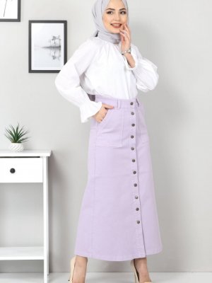 Tesettür Dünyası Lila Cepli Düğmeli Kot Etek