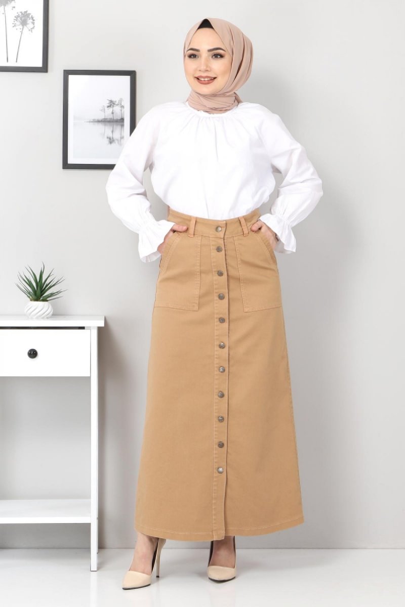 Tesettür Dünyası Taba Cepli Düğmeli Kot Etek
