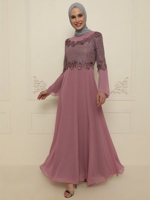 AYŞE MELEK TASARIM Koyu Gül Kurusu Taş Detaylı Abiye Elbise