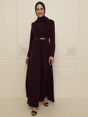 AYŞE MELEK TASARIM Mürdüm Şal Yaka Desenli Abiye Elbise