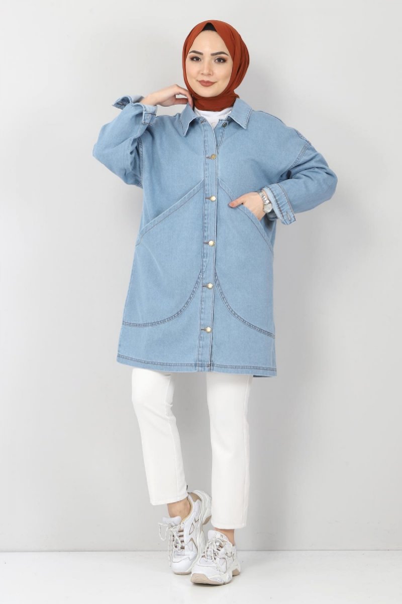 Tesettür Dünyası Açık Mavi Torba Cep Detaylı Kot Ceket