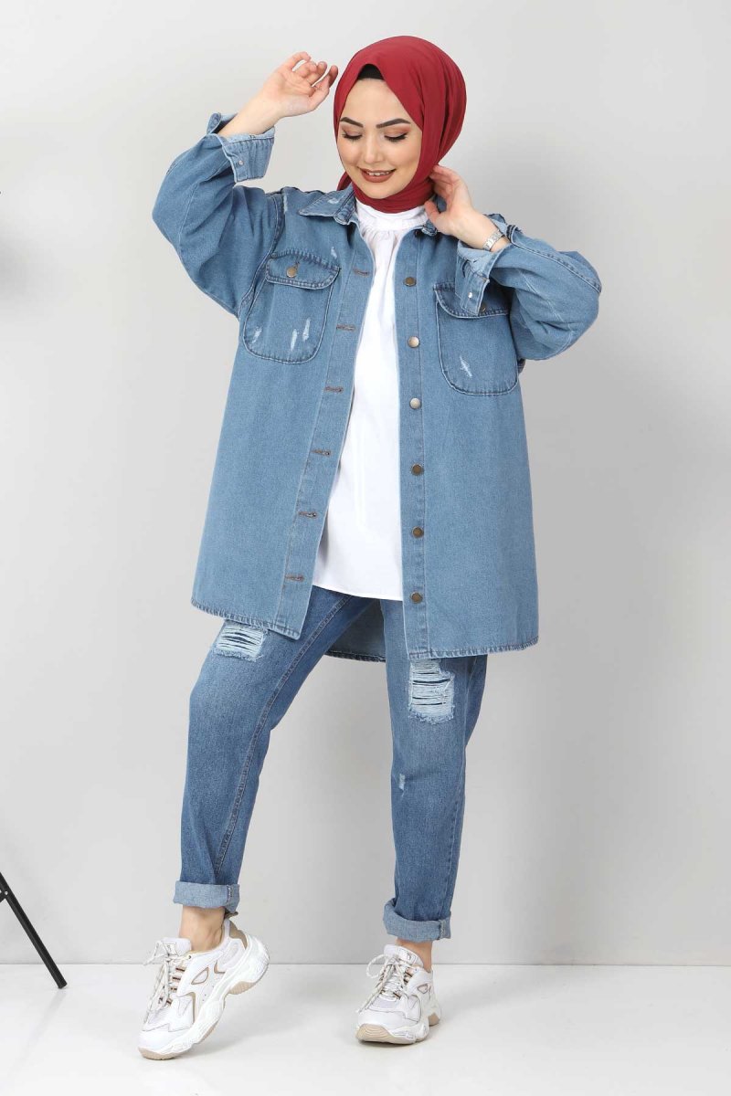 Tesettür Dünyası Açık Mavi Yıpratmalı Kot Ceket