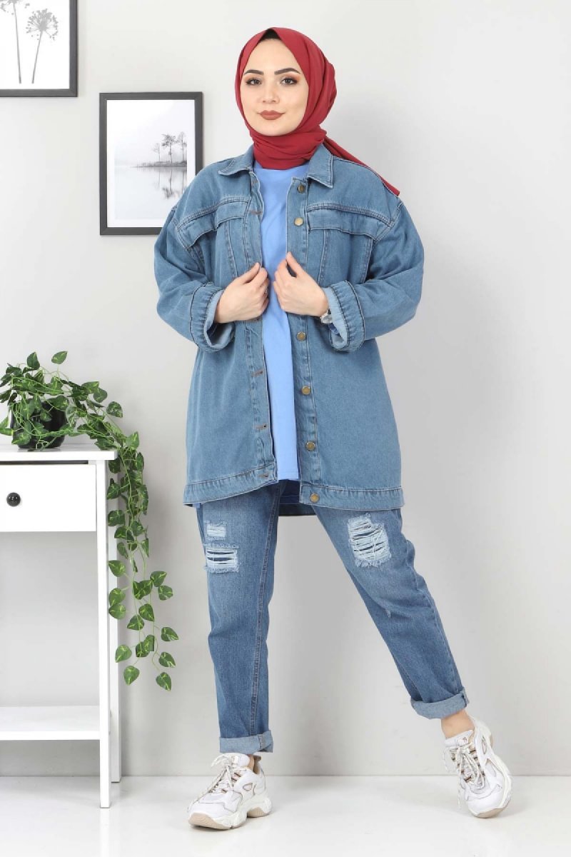 Tesettür Dünyası Açık Mavi Cep Detaylı Kot Ceket