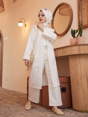 Tofisa Beyaz Cep Detaylı Uzun Ceket