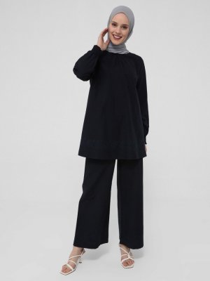 Refka Lacivert Etnik Nakışlı Geniş Paça Pantolon