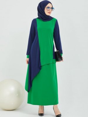 AİŞE MODA Yeşil Lacivert Tunik&Etek İkili Takım