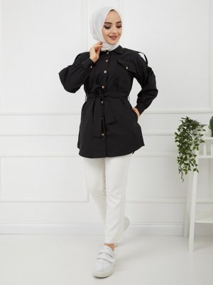 SAHRA BUTİK Siyah Çift Cepli Kuşaklı Tunik