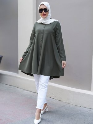 Por La Cara Haki Önden Düğmeli çan Etek Gömlek Tunik