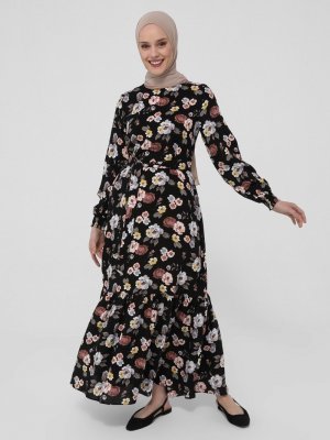Refka Siyah Desenli Etek Kısmı Volanlı Viskon Elbise