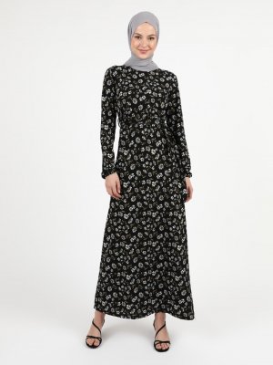 Zinet Siyah Çiçek Desenli Elbise