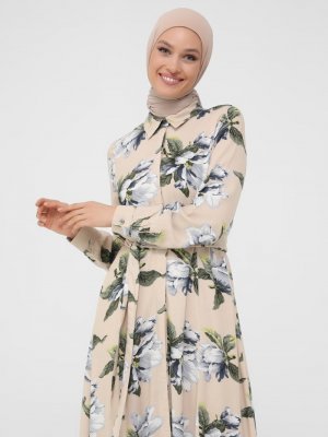 Refka Desenli Bej Doğal Kumaşlı Kuşaklı Gömlek Elbise