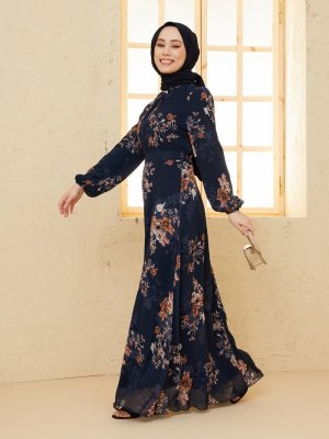 BÜRÜN Lacivert Çiçek Desenli Elbise
