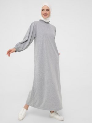 Benin Gri Kol ve Yaka Gipe Detaylı Rahat Elbise