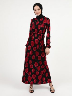 Zinet Siyah Bordo Çiçek Desenli Elbise