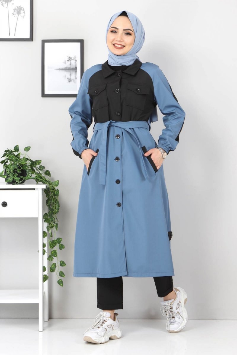 Tesettür Dünyası Mavi Çift Renkli Trençkot