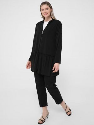 Alia Siyah Büyük Beden Fırfırlı Rahat Örme Kap Pardesü