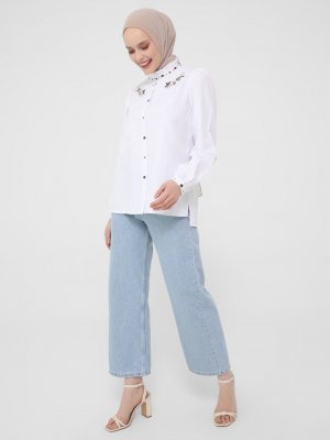 Refka Beyaz Çiçek Nakış Detaylı Yakası Fırfırlı Gömlek