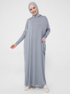 Refka Mavi Gri Doğal Kumaşlı Cep Detaylı Elbise