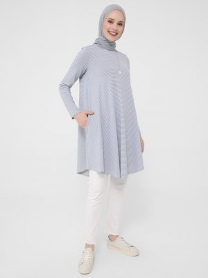 Refka Mavi Gri Doğal Kumaşlı Çizgili Tunik