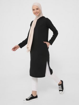 Refka Siyah Doğal Kumaşlı Yırtmaç Detaylı Kapüşonlu Tunik