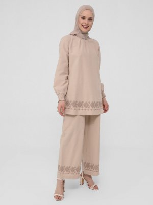 Refka Badem Etnik Nakışlı Geniş Paça Pantolon