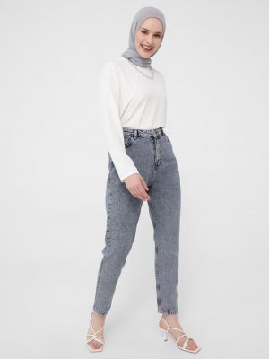 Refka Mavi Asit Yıkama Mom Kalıp Kot Pantolon