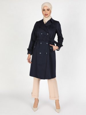 Olcay Lacivert Pelerinli Kruvaze Astarlı Trençkot