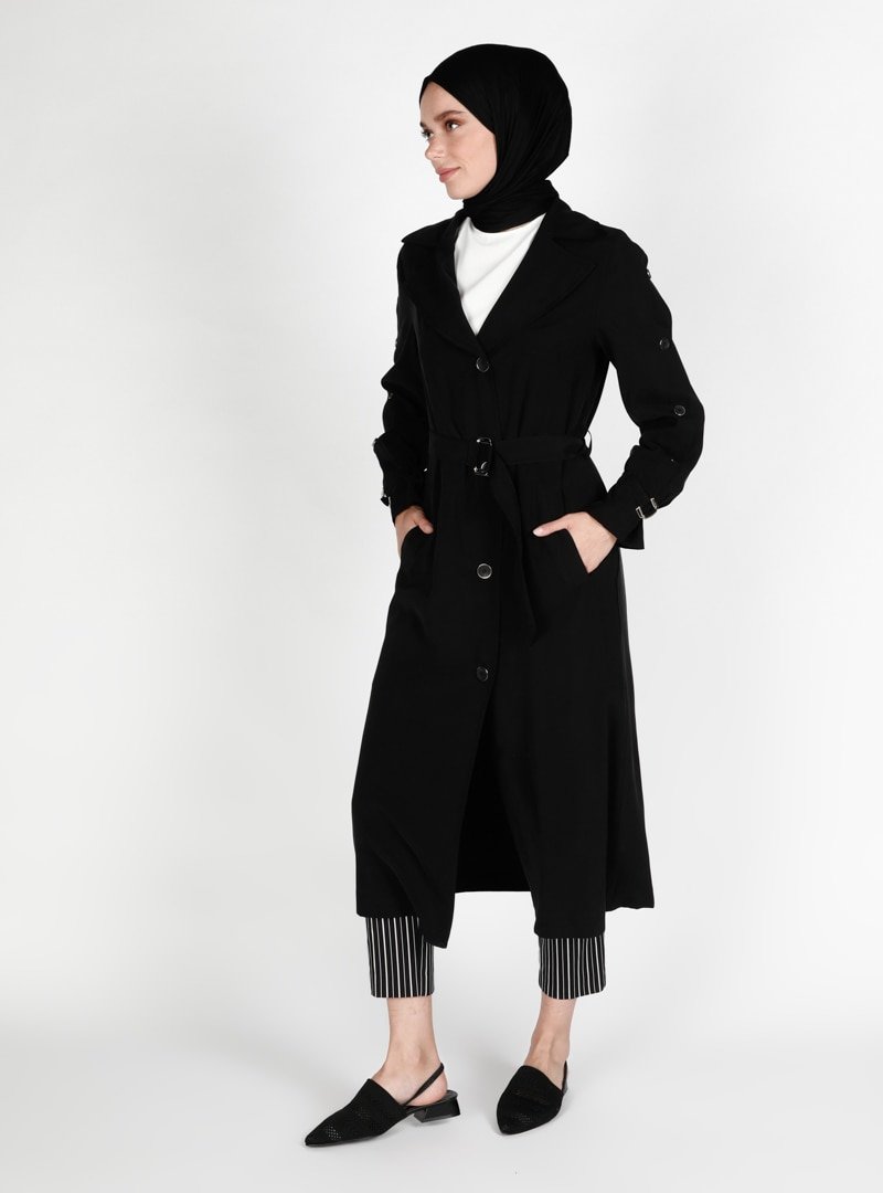 Olcay Siyah Düğme Detaylı Trençkot