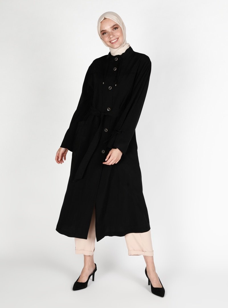 Olcay Siyah Düğme Detaylı Pardesü