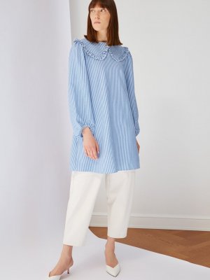 Trendyol Modest Mavi Çizgili Yaka detaylı Tunik Elbise