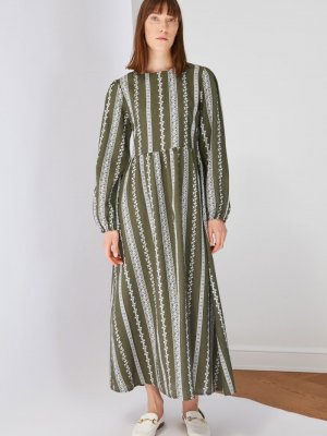 Trendyol Modest Haki Bisiklet Yaka Desenli Elbise