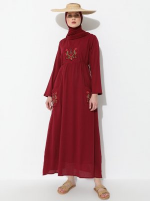 Elis Şile Bezi Bordo Şile Bezi Nakışlı Elbise